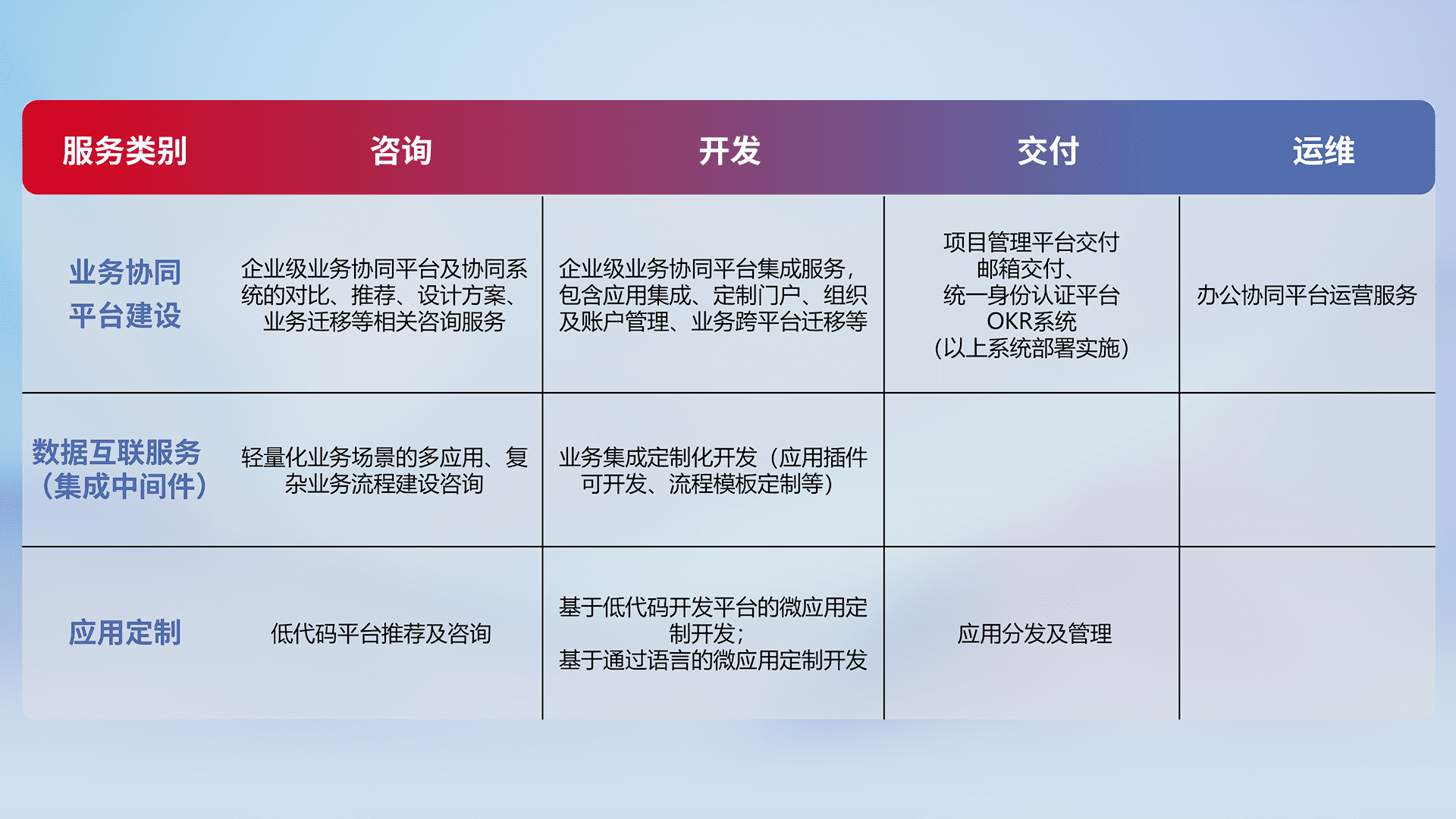 针对钉钉、、企微、、、IDaas等平台级产品提供产品的规划、、方案、、、、交付、、、、定制化开发等服务,,,,实现如统一协同办公、、、、智能客户服务、、混合会议管理、、智能数据查询、、等业务场景,,,实现数字化转型。。。。