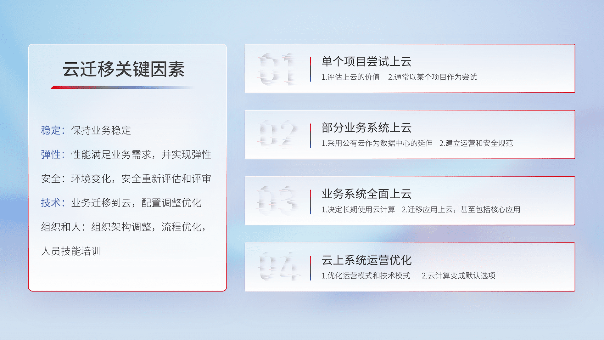 结合实际业务,,从规划设计、、、云平台选型、、、云原生改造、、、数据迁移、、、集成交付,,,,迁移全过程为客户识别最佳上云路径,,,做好风险识别管理,,,,设计网络架构、、、、身份权限、、安全审计合规、、操作审计、、、日志审计、、、监控告警策略、、、多站点容灾设计等,,,,对云上基础设施进行整体规划,,,,提升IT治理水平,,,以满足弹性、、高可用、、、高性能的需求。。。