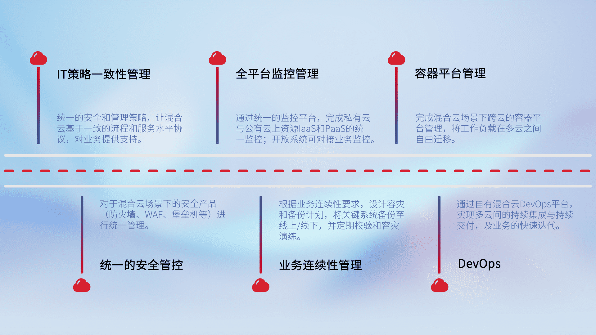 通过多云纳管,,,以统一的资源数据模型把客户的云资源进行抽象和封装,,,,进而实现对多云资源的统一操作,,,,保障云资源管理的可靠性、、稳定性与可用性。。。。量身定制化运维内容,,,,配置、、开发运维、、补丁管理、、、、备份、、、、监控、、、、认证和访问管理、、审计和日常巡检等,,,,保障在用云过程中的可靠度,,稳定度以及高可用率。。。。